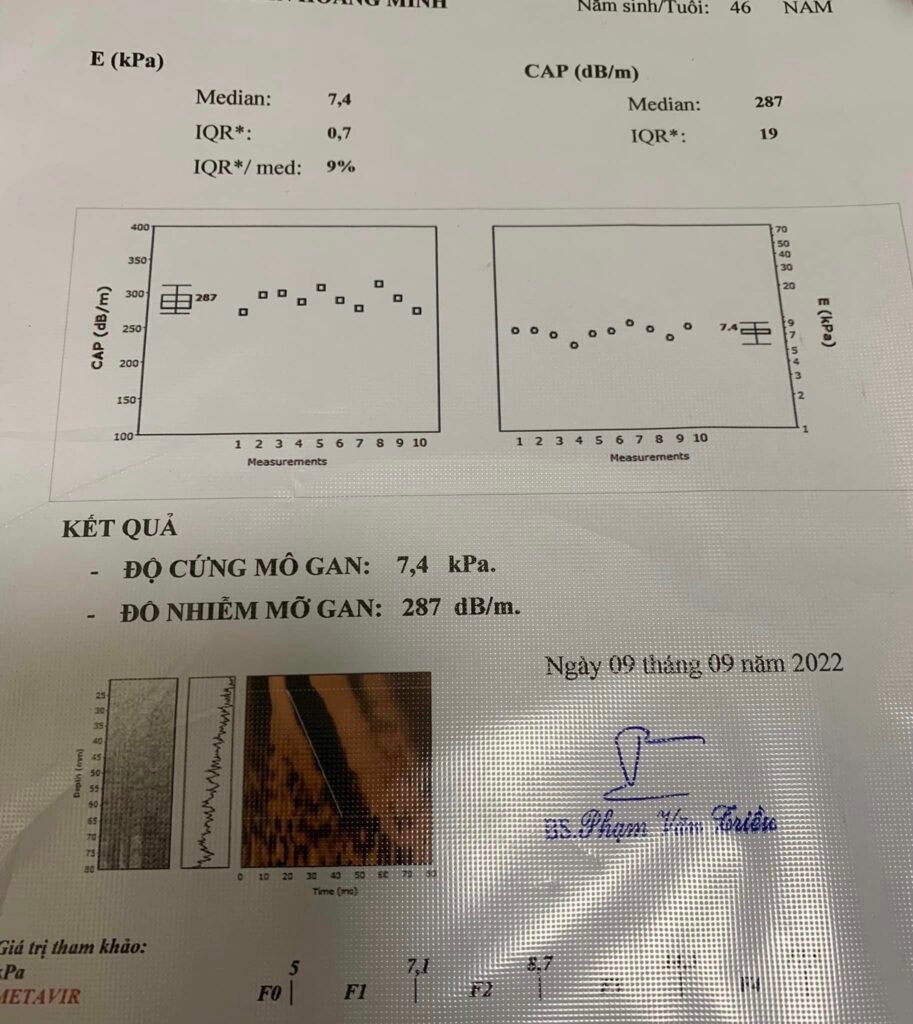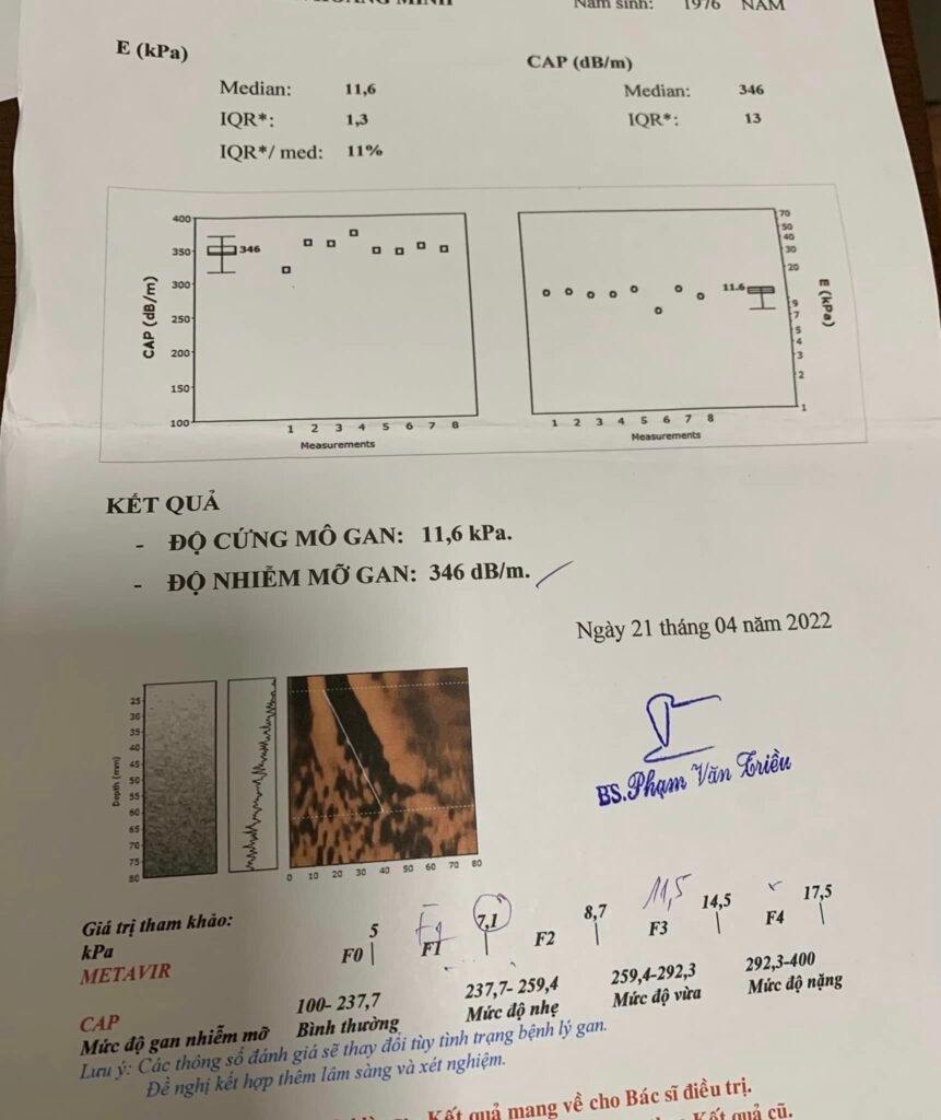 Chúng tôi áp dụng phác đồ hội chứng chuyển hoá đánh vào mục tiêu: đái tháo đường, dư cân, gan nhiễm mỡ. Sau 3 tháng điều trị bệnh nhân giảm 5kg, độ nhiễm mỡ giảm khá nhiều, xơ hoá gan về F1. Bệnh nhân rất mừng và cảm ơn chúng tôi rối rít.