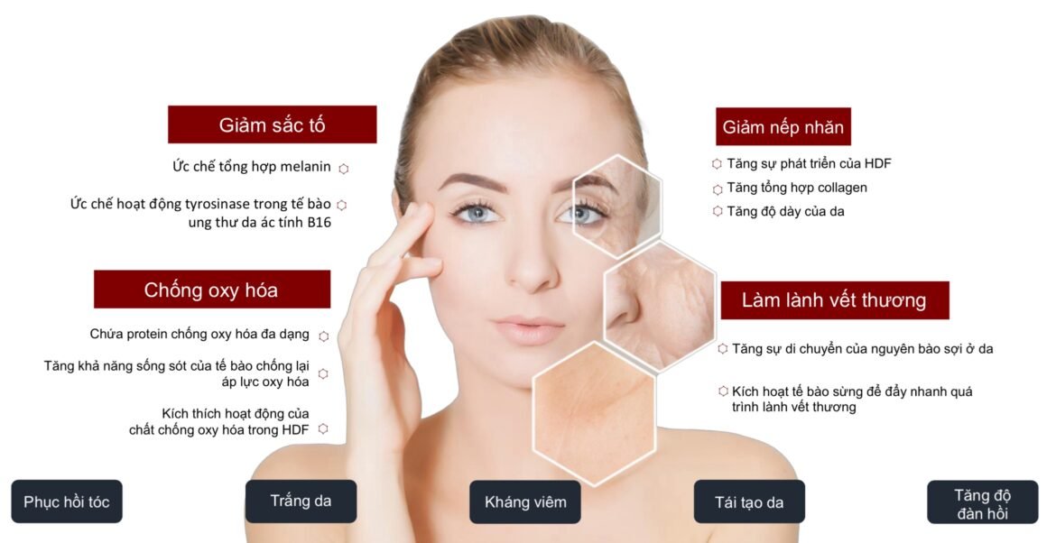 • Xóa nếp nhăn, trẻ hóa da: với hoạt chất kích thích sản sinh collagen và elastin, giúp làm đầy nếp nhăn, tăng độ đàn hồi cho da, mang lại hiệu quả trẻ hóa da rõ rệt.