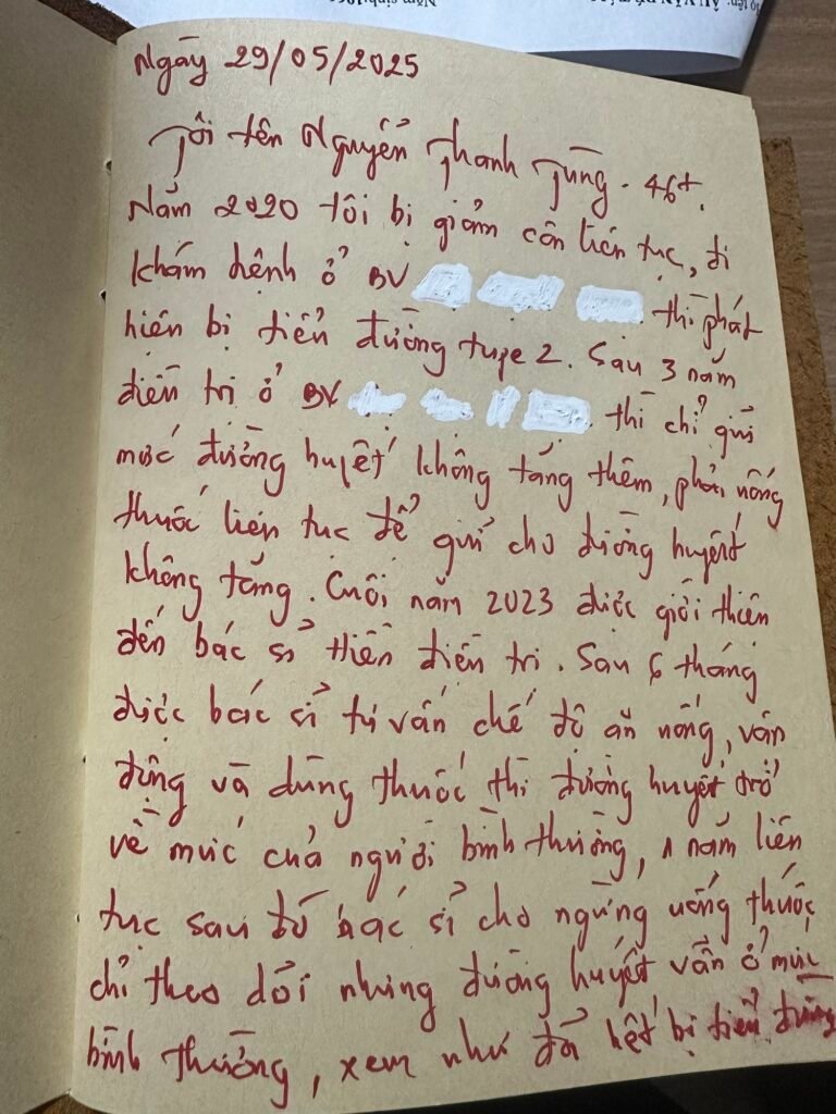 Năm 2020 tôi bị giảm cân liên tục, đi khám bệnh ở BV… thì phát hiện bị tiểu đường type 2. Sau 3 năm điều trị ở BV … thì chỉ giữ mức đường huyết không tăng thêm, phải uống thuốc liên tục để giữ chỉ số đường huyết không tăng. Cuối năm 2023 được giới thiệu đến bác sĩ Hiền điều trị. Sau 6 tháng được bác sĩ tư vấn chế độ ăn uống, vận động và dùng thuốc thì đường huyết trở về mức của người bình thường, 1 năm liền sau đó bác sĩ cho ngưng uống thuốc, chỉ theo dõi nhưng đường huyết vẫn ở mức bình thường, xem như đã hết bị tiểu đường.