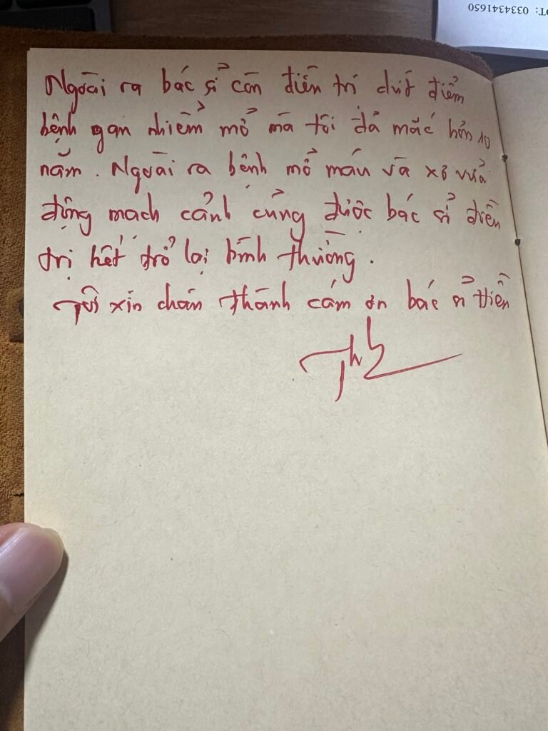 Ngoài ra bác sĩ còn điều trị dứt điểm bệnh gan nhiễm mỡ mà tôi đã mắc hơn 10 năm. Ngoài ra bệnh mỡ máu và xơ vữa động mạch cảnh cũng được bác sĩ điều trị hết trở lại bình thường.